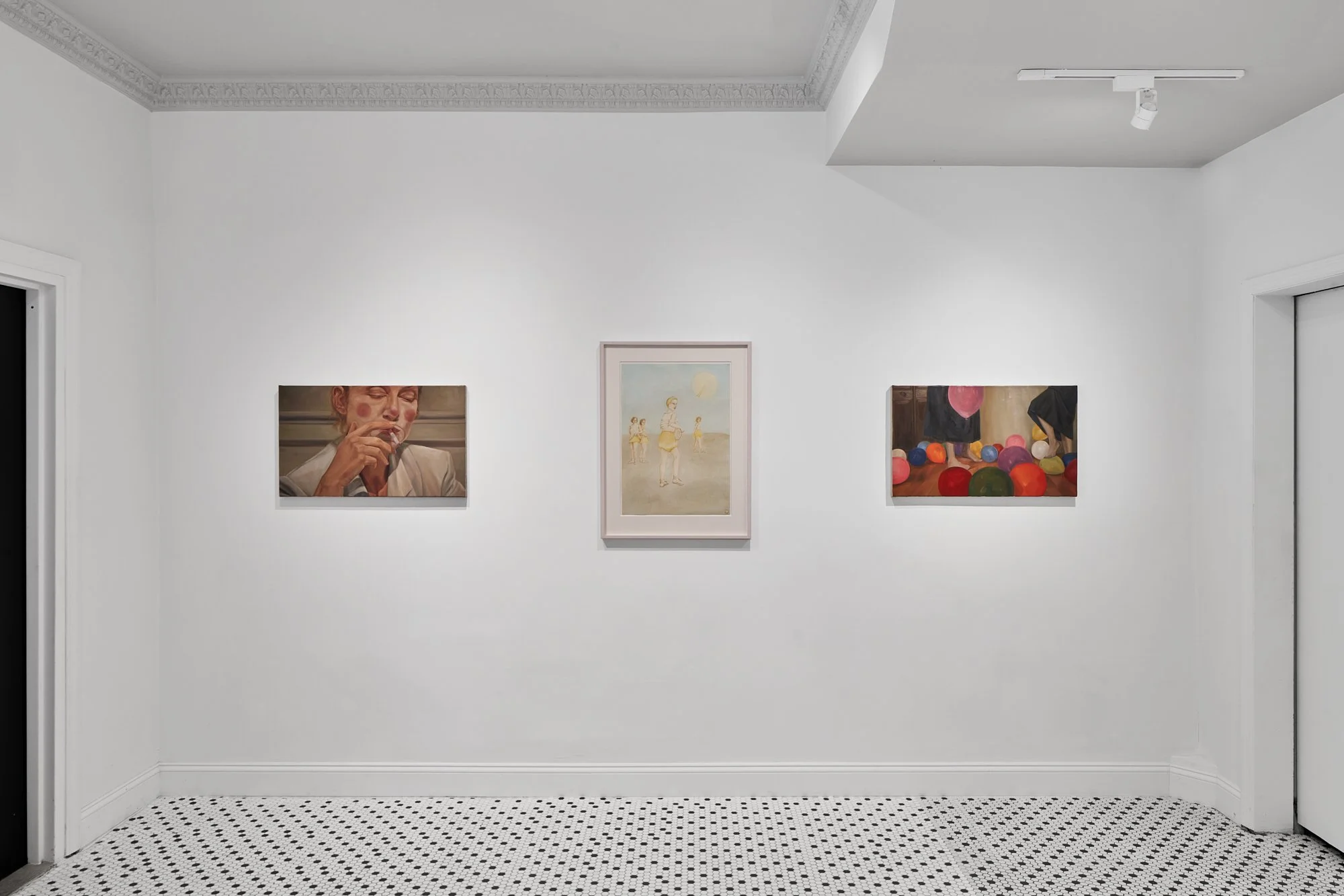 Each image is also an act of restraint, a means of refusing a wholesale narrative. The viewer only receives a glimpse of each scene, being denied any stable avenues for interpretation. In Up to nowhere, for instance, a woman in white is seen crawling up an ominous staircase, the where and why lingering as core questions. This falls in line with one of Towers’s main concerns, that of the subject’s performance. While her figures are often rendered in isolation, Heart locket presents two women tangled up in a strange plot. Is the subject at the fore being dressed or undressed by the one looming behind her? The contrast between the depicted fabrics sparks something too; the leather’s hardness clashes against the softness of a nightgown.